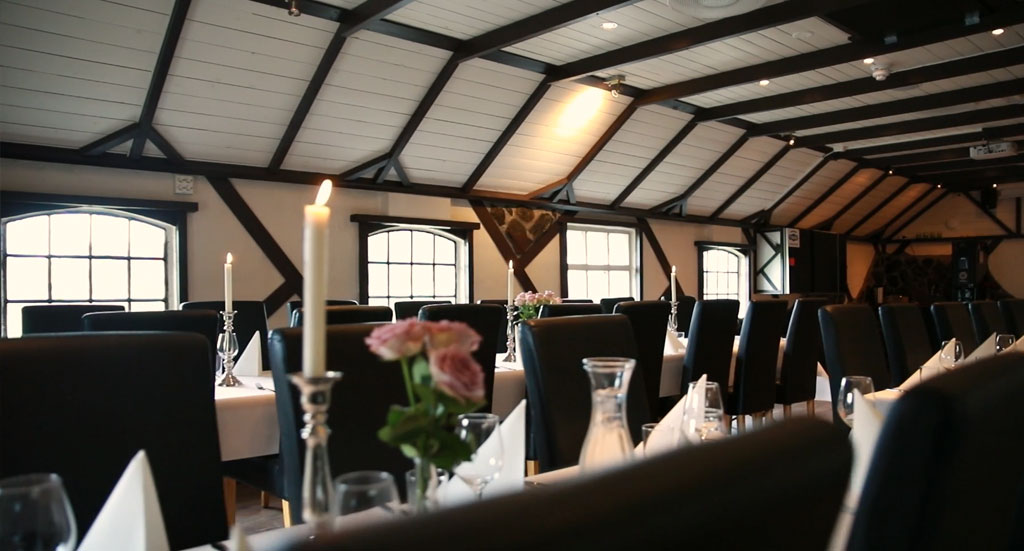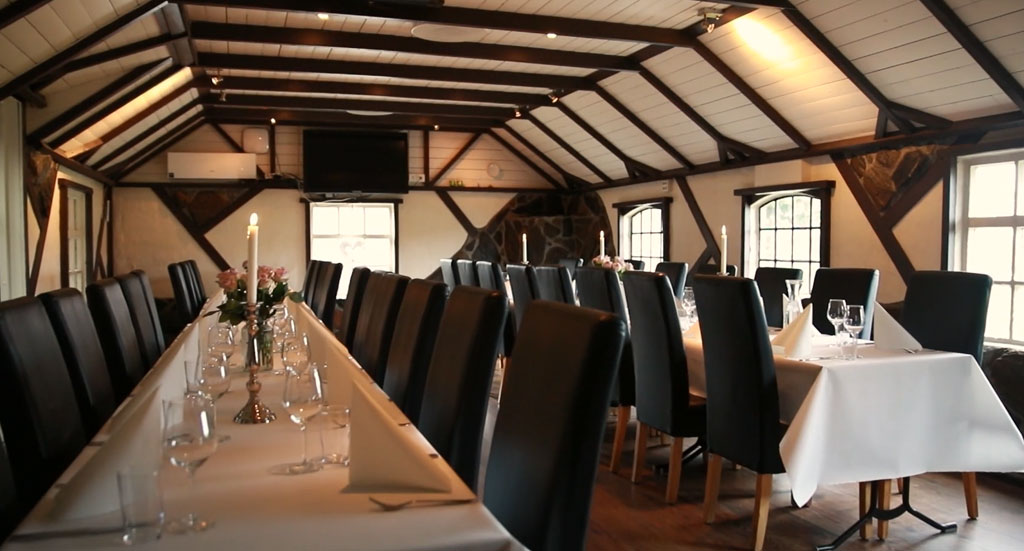 Huset ble i sin tid brukt som grisehus. Det er nå bygget om til spiserom/konferanserom. Her er det tilgang til trådløst nett, prosjektor, og musikkanlegg. Videre har vi montert høyttalere i alle rom, slik at musikk kan nytes i spisesalen, så vel som i baren, eller hagestuen. I det ene hjørne har vi også laget peis, så her kan man hygge seg på ekstra kalde kvelder med fyr i peisen. Bygget er totalrenovert og ble i fjor «bundet» sammen med proshopen med en gang. Gangen tar deg også ned til toalett.